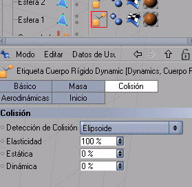 o para las esferas, ponemos en la pestaña colisión, detección de la colisión = elipsoide. Por defecto pone ninguna, y es necesario asignarle un tipo de colisión, que al tratarse el objeto de una esfera nos sirve perfectamente el tipo elipsoide.