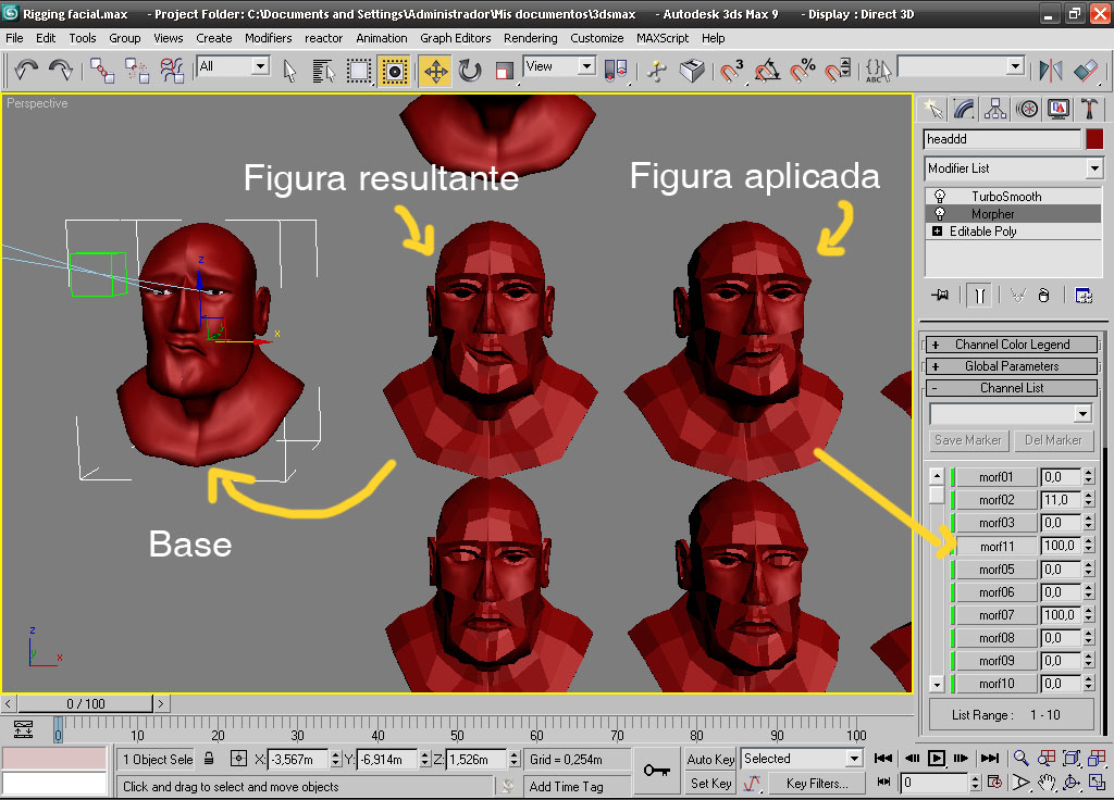 Hola, estoy haciendo el rigging de una cara haciendo varias poses. En uno de los pasos que hago es duplicar una serie de caras y aplicarle el reflejo para tener el otro lado, pero al añadirselo al modelo con Morpher y probar alguno de ellos no interactúa esa otra parte (figura aplicada), si no que interactúa la original (figura resultante).