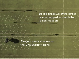 Of course, every shadow and light effect for the Shadeless objects had todo be Painted in the textures, or baked in some way, the casted shadows of Street-lamps and baskets have ben baked by a rendering from above, and the alpha channelled image has ben mapped on an untraceable plane todo match their location.