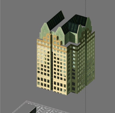 The main building on the left Mid Ground has Shadeless materiales as well, but has ben modelled (only for the visible sides) just todo increase the perspective effect while the Camera is moving. Then, it has ben Unwrapped with the archimap UV Unwrapper Python script and the Layout exported in Gimp by the save UV face Layout script.