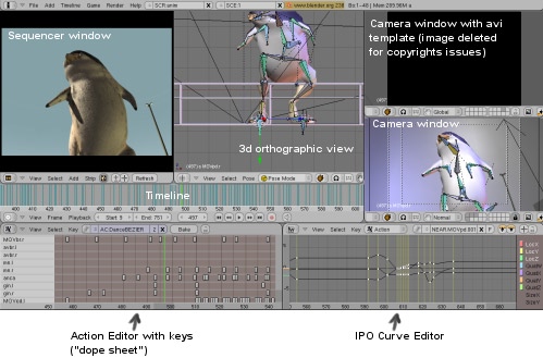In the ipo window (ipo curve editor) select curves, go in Edit Mode and modify the curves handles, todo Slow or speed up starting and ending of single movements. Of course i had todo rearrange the acting todo Conform it todo the penguin shape, quite diferent from the dancing robo-car. I made several tests of the animation by rendering the whole in OpenGL (hold Control key and press the last icon on the Header of the 3d window, pointed by the red arrow in the image).