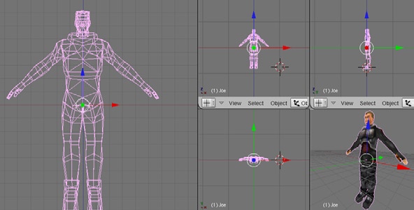 Next, make sure the cursor is centred on the pelvic área of joe from the front and side views. [spacebar] add >> armature. This is going todo create a new armature or bone system for our Mesh joe. you should have something very similar todo the image.