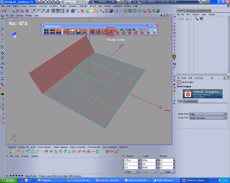 Ya podemos empezar a darle forma a nuestro objeto. Seleccionamos los polígonos que queremos rotar, en este caso uno de los laterales. Va a ser sencillo ya que el giro será de 90 grados. Si usamos la herramienta Hinge rotate del plugin Mesh surgery no tendremos más que pulsar el icono correspondiente y entonces al pasar el ratón sobre cualquier arista veremos que se vuelve de color verde indicando que el giro lo haremos usando esa arista como pivote. En la parte superior izquierda de la vista veremos que aparece un gráfico indicándonos el ángulo de giro, no tendremos más que mover el ratón sobre la arista que queramos usar de bisagra y desplazarlo hasta que el gráfico nos muestre el ángulo de 90 grados.