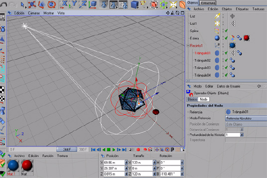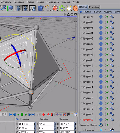 Probemos la animación, con reproducir, de forma que cuando la esfera, al moverse, se acerca o aleja de la cara del triangulo01, éste se cierra o abre a modo de diafragma.