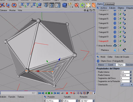 Seleccionamos el disco, en la escala del objeto asignamos el valor 0,6 a s.x, s y, z, para que se ajuste el triángulo a la cara del icosaedro.