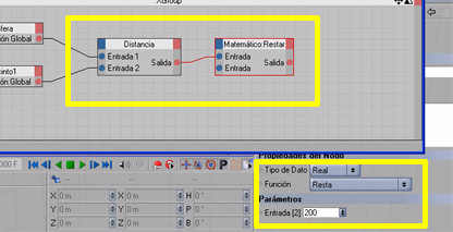 Insertamos un nuevo nodo, botón derecho dentro de la ventana Xpresso: nuevo nodo > Xpresso > calcular > matemático, luego enlazamos los puertos rojos de salida (del nodo distancia) al puerto superior entrada (del nodo matemático).