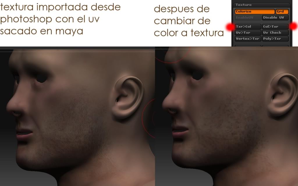 Buenas, mira, ya pude solucionarlo, la cosa era que tienes que ponerle en primer lugar, unas 6 subdivisiones o 5(o las que la memoria de tu máquina te permita, igualmente con 5 o 6 ya te va a andar muy bien), a la Maya de ZBrush, para que pueda agarrar una mejor definición la textura, y luego, después de que terminaste de pintar todo el personaje, as a texture en el menú de arriba y creas una textura nueva de unos 4000x4000 y ahí sí, le das intensidad de textura un 100% y finalmente aprieta col>TeX, te va a demorar un poco el proceso, te va a quedar por un segundillo, el personaje blanco pero finalmente lo ves con la textura que tú le pusiste, y listo, exportas la textura y listo para usarla en Maya, espero que te sirva, cualquier a las ordenes. Saludos.
