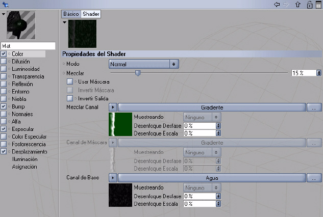 Creamos un nuevo material. Lo primero que vamos a hacer es crear nuestro gradiente animado, como he dicho antes las pruebas se deberían hacer en el canal de Bump o en el canal de color para ahorrar en tiempos de render, y una vez que se tuviera un resultado satisfactorio lo copiaríamos y pegaríamos en el canal de desplazamiento. Pero nosotros ya pisamos sobre seguro así que, vamos al canal de desplazamiento y lo activamos.