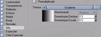 Y lo abrimos haciendo doble click en él. Para este efecto vamos a usar el canal alpha, el canal alpha nos sirve para enmascarar partes del material mediante una imagen (en este caso un shader) en blanco y negro. Así seleccionamos alpha y en textura, pulsando a la flecha que apunta a la derecha, seleccionamos gradiente.