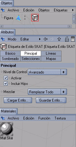 Mediante la etiqueta de estilo skat, la cual al aplicarla a un objeto, automáticamente activa skat en efectos de configuración de render y se crea un material sketch asociado a ella (se añade haciendo click con el botón derecho, del ratón sobre un objeto en el gestor y yendo a sketch etiquetas, o en el menú archivo del gestor de objetos). Otra alternativa sería creando un nuevo material sketch y asignándolo a un objeto, lo que crearía una etiqueta de estilo skat y activaría skat. Cada vez que asignamos un material sketch a un objeto, se crea una etiqueta de estilo skat asociada a ese material. (nota: skat no se activa automáticamente sólo por añadir un material sketch, ni añadiendo la etiqueta de render skat, ni añadiendo los Shaders skat en los materiales). En la imagen podemos apreciar la etiqueta de estilo skat aplicada a un objeto, con sus atributos y el material sketch asociado a ella.