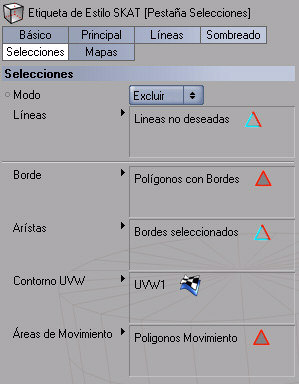 La función de la pestaña selecciones es restringir los efectos del skat a partir de etiquetas de selección o UVW. o el recuadro líneas afecta a todas las líneas, las cuales serán excluidas o incluidas en el skat según decidamos. Hemos de arrastrar una selección de aristas guardada o borde: permite restringir, mediante etiquetas de selección de polígonos, aquellos polígonos que deseamos incluir en el efecto borde, el cual ha de estar activo. o arista: al introducir una etiqueta de selección de aristas, le estamos diciendo que únicamente represente estas aristas, cuando el tipo de líneas aristas esta activo.