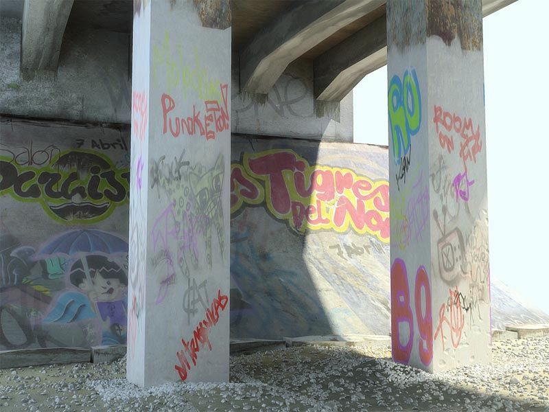 Hola, los grafittis están muy bien, el estilo de la imagen me gusta. Comparto lo de las piedras, y creo que el material base de las columnas está demasiado limpio.