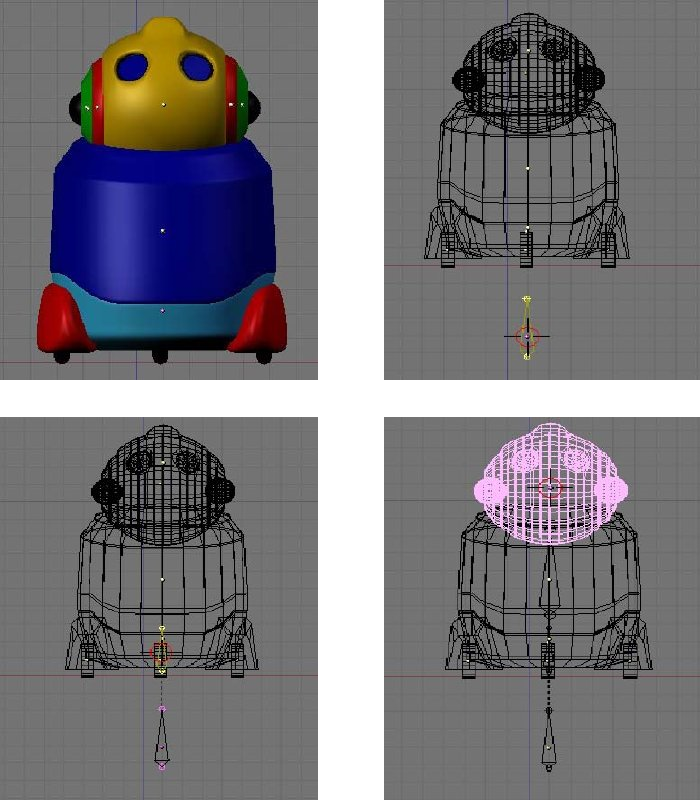 The fact that Gaurav modeled paperos head as all sepárate parts, presents us with an interesting option for giving our robo an interesting action set. We are going todo animate the ear rings and ear ball shooting out from the side of his head as he rolls along. We are going todo accomplish this by using action constraints.