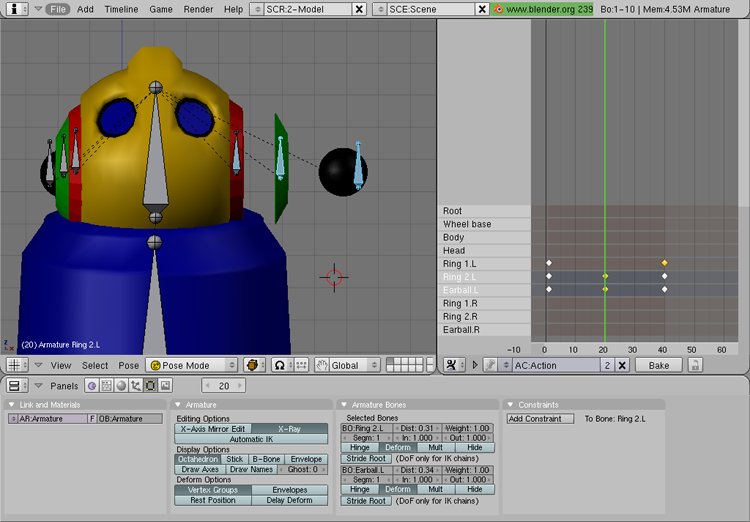 At this point you can go bak todo your ear action and add in actions for the right side of the robo, so that both sides pop out at the same time. After you have added in the new actions for the right side, dont forget todo add action constraints todo the right side ring 2. R and earball. R Bones.