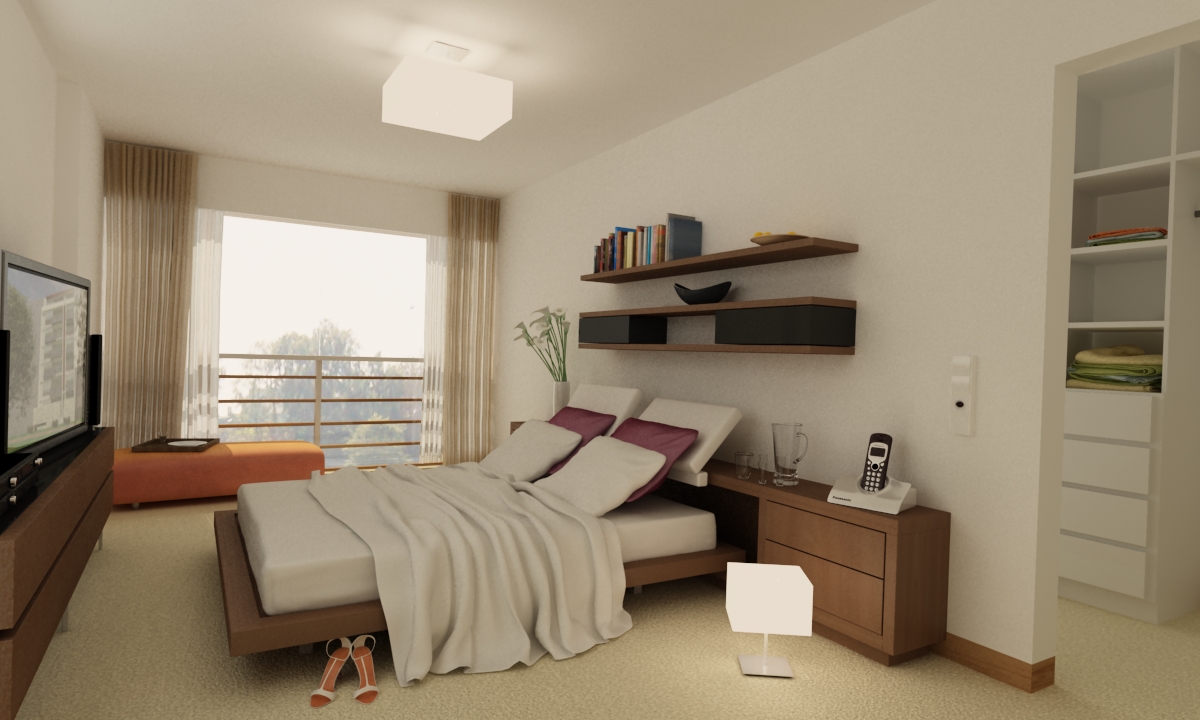 Muy buenas las imágenes. En el dormitorio me parece que las lámparas son las que destinan, por la iluminación aparte, y el piso que al parecer es alfombra se le podría retocar un poco, me parece.