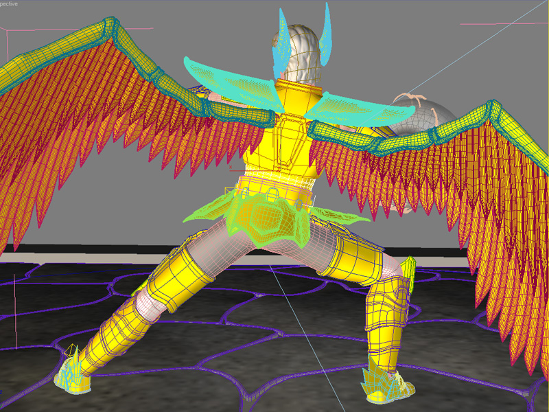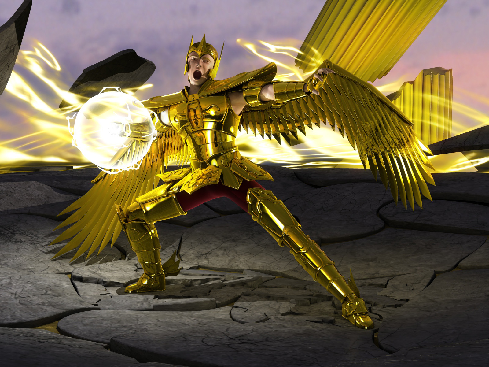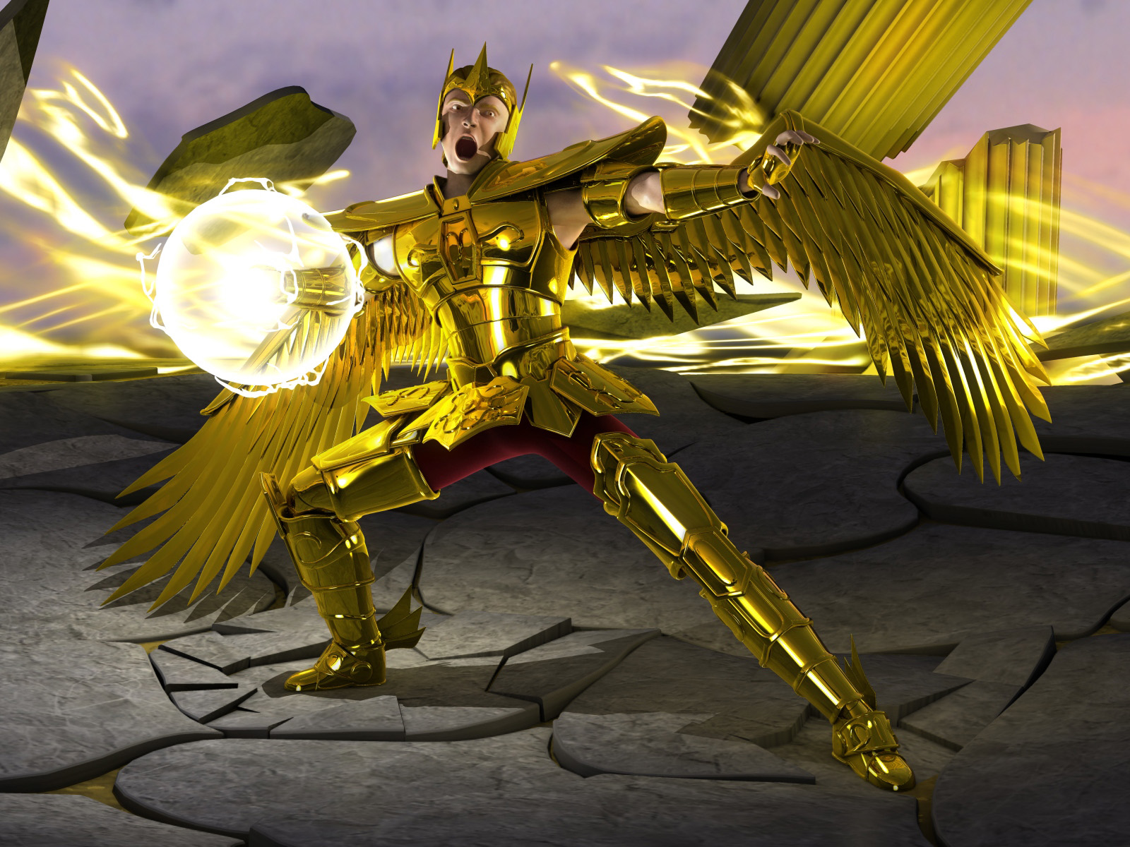 Otra de las cosas que me hizo no querer poner tantos elementos aparte de la falta de tiempo son los reflejos. Al reflejar el suelo oscuro y el cielo brillante, se daban líneas de contraste por toda la armadura muy del estilo del manga, de tener montones de cosas volando y todas reflejadas, a lo mejor quedaba más feo. Un metal es bueno según lo que refleja. Para que comparéis pongo una imagen de la sacred saga.