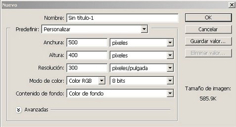 (1) crear un nuevo documento de 500 por 400 píxeles con una resolución y 300 dpi en modo de color RGB, con el fondo blanco.