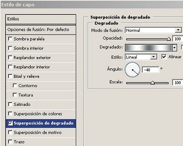 (3) abre el menú (capa)+(estilo de capa)+(superposición de degradado) puedes añadirle la combinación que quieras, de preferencia el estilo (plateado)+(opacidad 100%)+(ángulo - 40°)+(escala 100%).