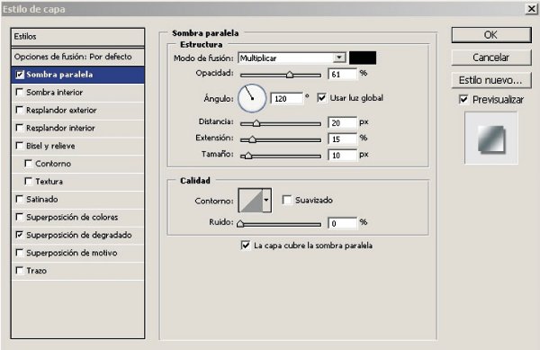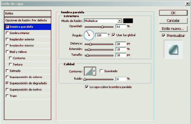 (9) ahora seleccione la primer capa de texto y le aplicas un estilo de capa (sombra paralela) escribe los siguientes valores (opacidad 61%)+(ángulo 120°)+(distancia 20 px)+(extensión 15%)+(tamaño 10 px).