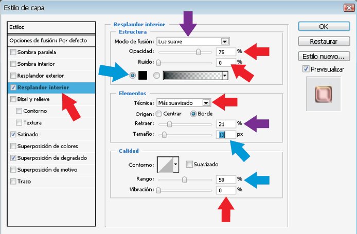 4.- Ahora nos vamos a capas y le aplicamos otro estilo de capa (resplandor interior) y escribimos los siguientes valores (modo de fusión luz suave)+(opacidad 75%)+(ruido 0%) y el color se lo cambiamos a negro+(técnica más suavizado)+(origen borde)+(retraer 21%)+(tamaño 13px)+(rango 50%)+(vibracción 0%).