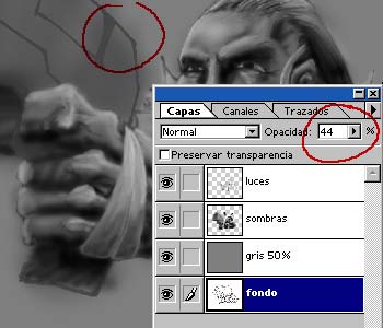 paso 4 : luces al igual que con las sombras, para las luces creamos una nueva capa por encima de la anterior. Añadimos los claros de modo similar, empezamos con grises suaves y continuamos con grises más claros a la vez que reducimos el tamaño de la brocha. Pero hasta este punto no uséis ni el color blanco puro ni os metáis en detalles minuciosos.