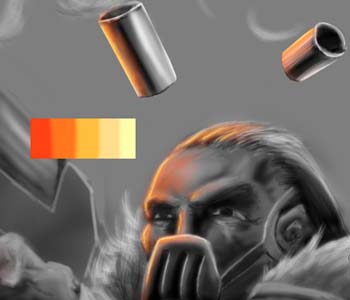 Sol otro detalle más de color. Una luz lateral de tono cálido similar a la del sol resulta también, bastante efectiva. Esta tiene varios tonos distintos de color y los he añadido en la imagen. La técnica similar, empezando por el color más oscuro con brochas amplias para acabar por el color más claro con la brocha más delgada y fuerte.