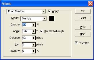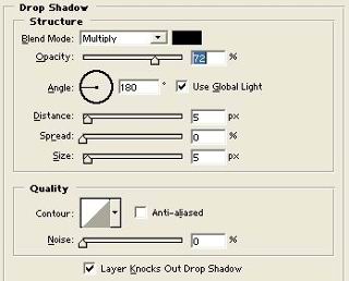En Photoshop 5 o anterior es un poco diferente el entorno de trabajo, por lo cual para localizar este efecto, te vas al menú de layer>>effects>>drop shadow (capa>>efectos>>sombra) y según tengas la dirección de la luz en tu dibujo coloca la sombra, los parámetro que yo utilicé están en la imagen de la izquierda.