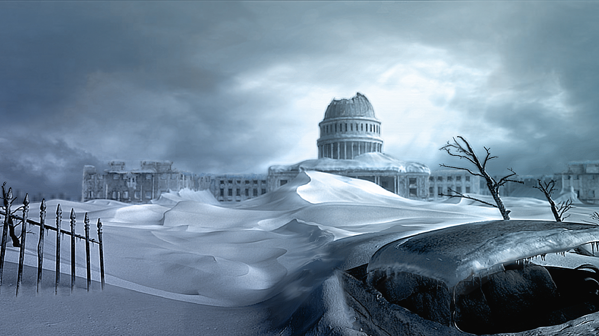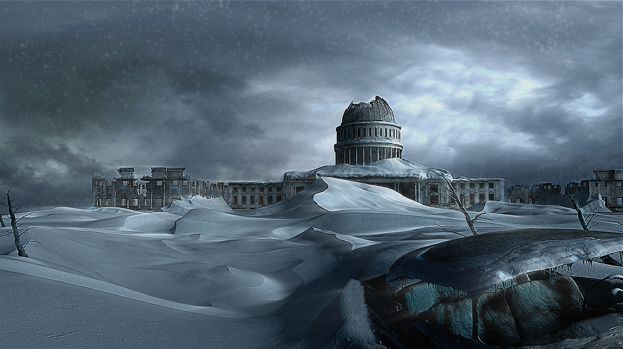 Está muy guapa la imagen. Lo que no me convence es el cielo. No sé si has pasado algún filtro, pero algunas partes de la imagen me parecen un poco borosas, (también puede ser por parte de mi pantalla). Cuando miro la imagen mi vista automáticamente primero se centra en el coche y después en el edificio detrás, pero no sé porque no me atrae hacia la izquierda. Tal ves se ve un poco vacío el tereno (pero por otra parte se supone que es una capa de nieve de gran altura y pocas cosas serán visibles.)prueba poner algún detalle más en la escena en la parte izquierda más tarde. Algo como algún semáforo congelado y probablemente huellas en la nieve (de algún animal o personas). No sé si quedará bien algún cadáver congelado en el coche, pero también es una posibilidad. Va bastante bien la imagen.