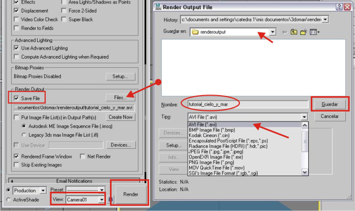 2.- Ahora nos ubicamos más abajo de la ventana del render setup y ubicamos las opciones de render output, ahí ubicaremos nuestra carpeta de salida del render, empezamos haciendo click en el botón files. Ahí nos aparece un cuadro donde asignaremos una carpeta de salida después le ponemos un nombre y elegimos el tipo de archivo de salida yo, por ejemplo, le puse en formato *.avi y listo luego click en guardar. Ya tenemos listo la ruta de salida ahora nos fijamos que la opción save file este activa y la vista de render este desde la cámara y por último solo nos queda clickear en el botón render y listo.