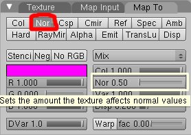 Ahora, necesitamos configurar las configuraciones más importantes del mapa de protuberancias. Estos controles están localizados en el material Shading panel [f5] bajo la pestaña map todo. Puedes elegir desactivar el color de la textura (col) cuando modificas tus mapas de protuberancias o de desplazamiento. Esto puede a veces darte una mejor idea de lo que está haciendo cada configuración.