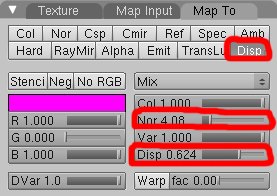 La forma en la que puedes crear un mapa de desplazamiento es muy similar a la forma en la que creas un mapa de protuberancias. La única diferencia es que tú debes activar el botón de desplazamiento (disp). Puedes desactivar el botón normal (NOR) dependiendo del efecto que desees.
