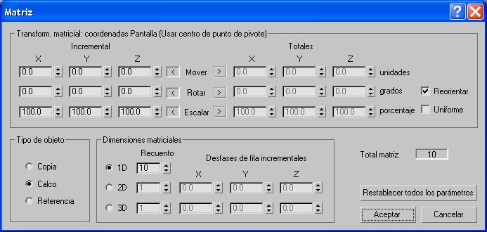 cuando se utiliza una orden de transformación manteniendo apretada la tecla de mysl se activa automáticamente el comando de clonación y se abre un cuadro de diálogo que pregunta si queremos crear una copia, una instancia o una referencia, así como el nombre que queremos dar al nuevo objeto. Otro tanto ocurre si utilizamos la orden de menú edición/ clonar. Y otro tanto si hacemos una matriz (array) o una simetría (mirror).