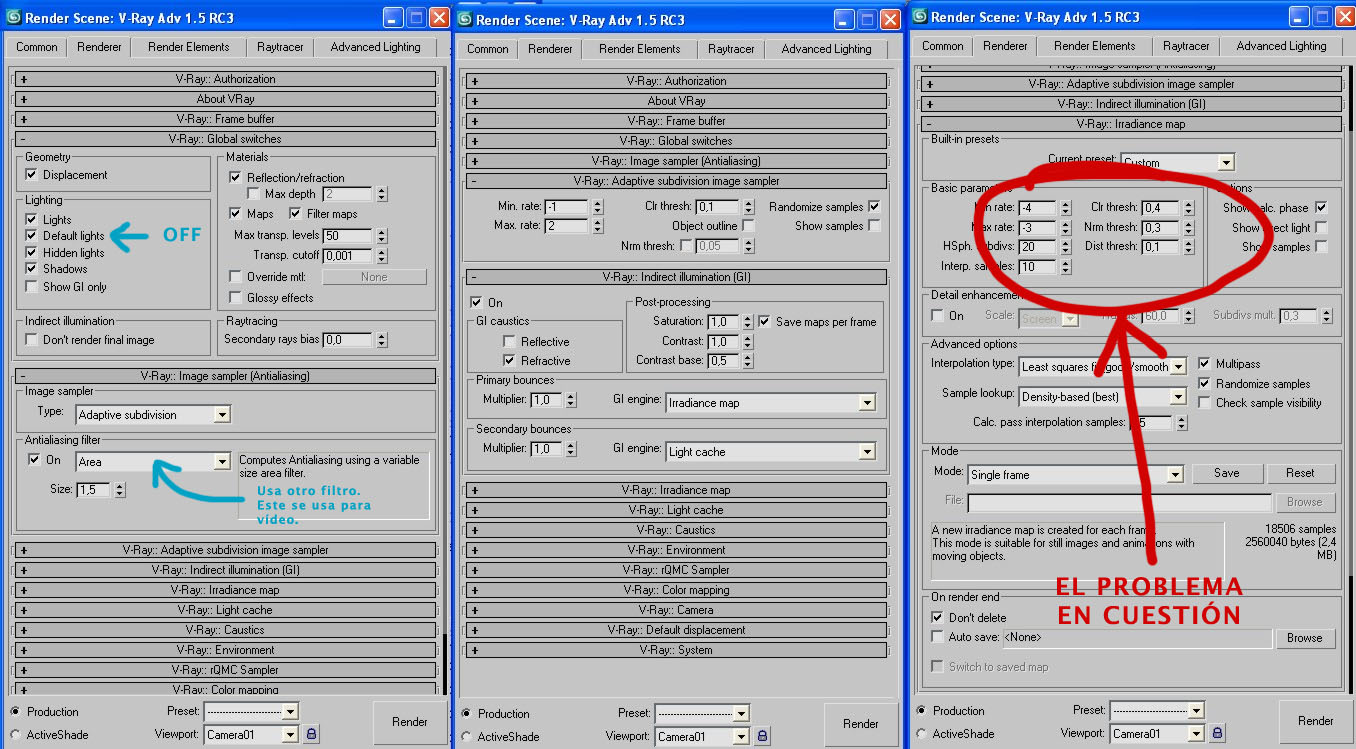 Pables, nos han puesto los colores, yo ya iba a buscar soluciones en brujasdeltresd.com. La verdad es que es cierto, cambié estos parámetros para una animación del mismo proyecto en otra estancia, con el fin de mejorar los tiempos de render.