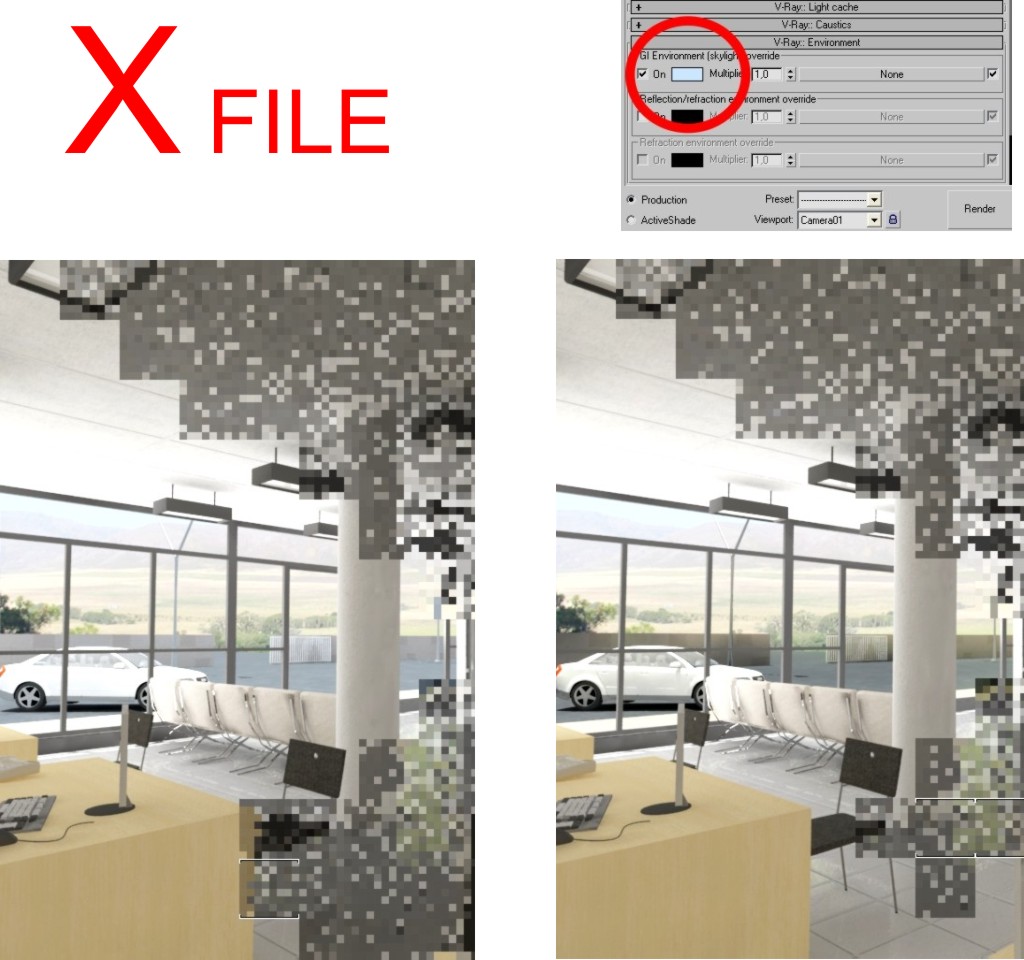 Ni expediente x ni leches. El problema está en la solución de global illumination, que es muy pobre. Ni para pruebas rápidas uso yo esos parámetros tan bajos.