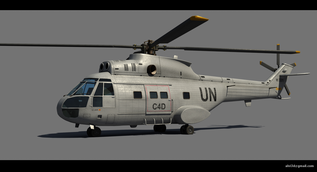 Bruixot, Karras, kuriaque y rafa120, gracias por los comentarios y por comentar. Karras, gracias por las imágenes. Voy a intentar ponerle ese camuflaje, aunque el modelo que yo he hecho es el modelo antiguo (puma), luego vino el super puma y el cougar. Hay algunos cambios entre estos modelos, aunque el perfil es muy parecido. Por ejemplo, el cougar tienen la parte para escamotear las ruedas traseras algo más pequeño que el puma, una ventanilla más y una especie de filtro en la entrada de la turbina que no lleva el sa 330. Incluso del sa 330, hay configuraciones distintas para el modelo civil, ejército de tierra, mar y aire.