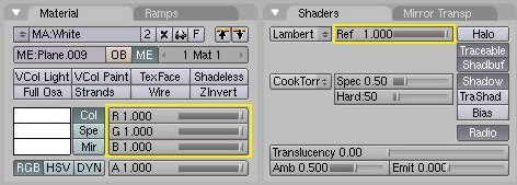 The white plane doesnt extend todo far, just far enough todo catch all the shadows of the objects. It is completely white, and the reflectivity is 1.0. Note that the option only shadow doesnt work with Yafray. This means the Edges of the plane would be visible in the FinalRender, which is not god. That is fixed in the render settings, se below.