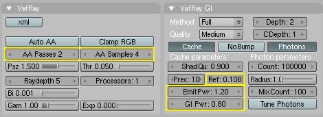 First, make sure that you have Yafray installed, and its location added todo your os Path variable (se the Yafray readme). In Blender, go todo the render buttons, and in the drop-down list under the large render button, select Yafray. This should open up two extra settings panels: Yafray and Yafray GI. In the Yafray panel, the xml button should be turned of, this allows you todo se the render in progress. The two buttons below allow you todo specify the antialiasing. The other buttons below these arent important now, they dont ned todo be changed. The other panel: Yafray GI is more important. The method drop-down list allows you todo select either none for no GI, skydome for a method similar todo Blender Ambient Occlusion, and full for the proper global illumination rendering. Selecting full Will open up new buttons on the bottom. The quality setting Will determine the (guess what.) quality as well as speed of the render, a setting of medium/high should be enough for most situations. If there are small Faces, detailed models, or surfaces very close todo each other, you might ned todo set the quality higher todo get rid of render artefactos.