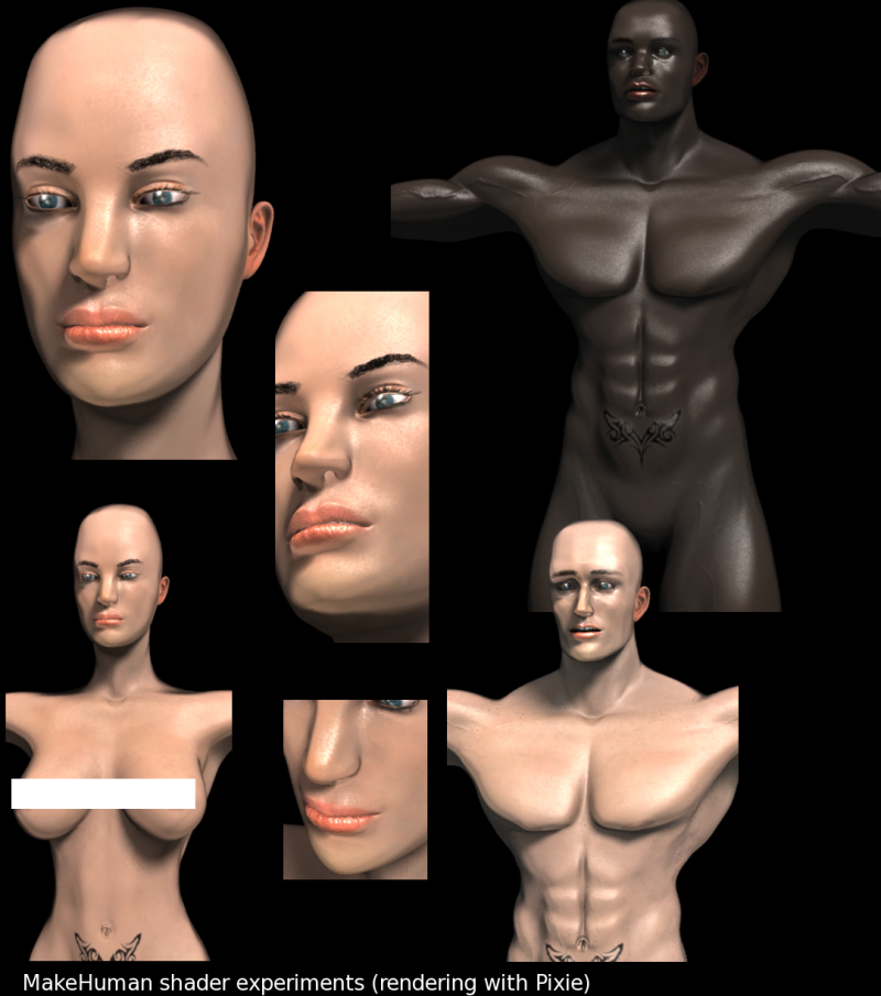 Currently only export in obj format is supported, yet Even though obj has become a standard, we have intentions todo add additional formats. Many features have already prototyped in Python, for example hair, which only neds todo be translated into C++ and adequately incorporated in the GUI. With regards todo rendering, we are working on a Skin Shader engine thats RenderMan compliant. Here are some images made with Pixie.