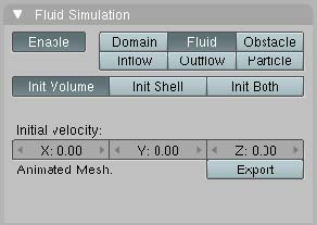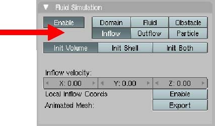 Presionamos el botón enable, y después el botón fluid. Esto significa que el cubo pequeño se convertirá en el fluido y se moverá solamente dentro del dominio, que es el cubo más grande.