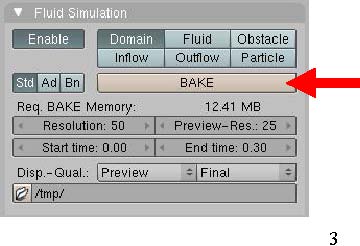 Ahora volvemos a seleccionar en cubo grande y vamos al panel fluid simulation, y presionamos el botón bake.