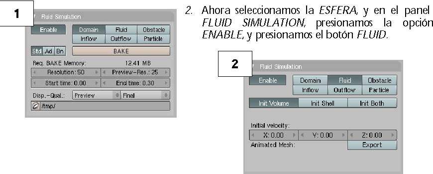 1. Seleccionamos el cubo grande y colocamos en el panel fluid simulation, la opción enable, y presionamos el botón domain.