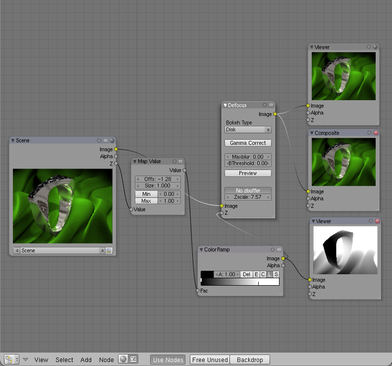 Utilizing the map value node together with a color Ramp node you can customize the z-depth image todo make it fit your neds. The map value node sets the Focal point while the color Ramp node Will adjust the size of the Depth of Field. And of course the nice viewer node gives us a direct feedbak on how the actually z-depth map looks like. And with the zscale value you have control about the strength of bluring.