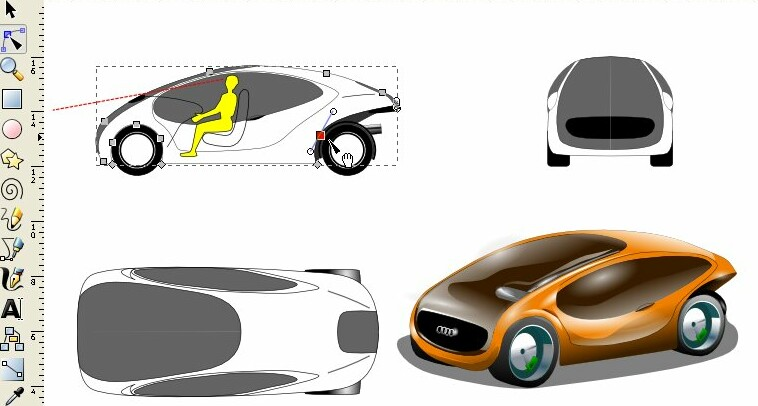 As you might have sen in car modeling tutoriales, it always takes blueprints of that particular car and the same is neded for your own concept. For some precise blueprints you can use freeware Vector software like Inkscape (like i did). Inkscape a los helped me go one step ahead of my sketches, making a colored illustration. When working on the blueprints, y would advise todo kep an existing car blueprints on the background todo kep the proportions in check.