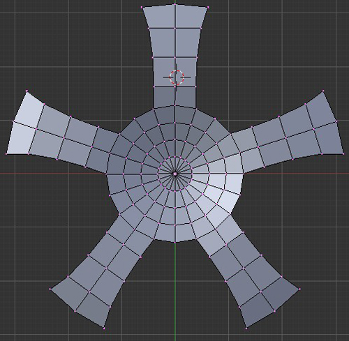Go bak todo the second layer, where you have the primitives for the spokes. Select the bottom four cubes on each spoke and deleete the Faces. Move the center of the spokes from the first layer todo the second, where your spokes reside. Se fig 17.