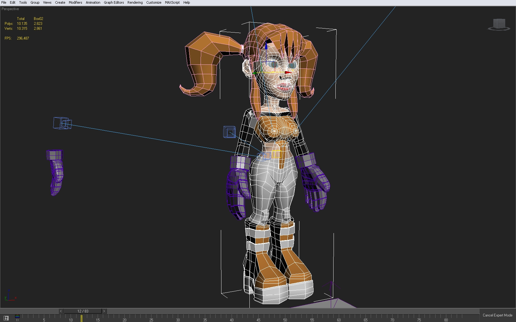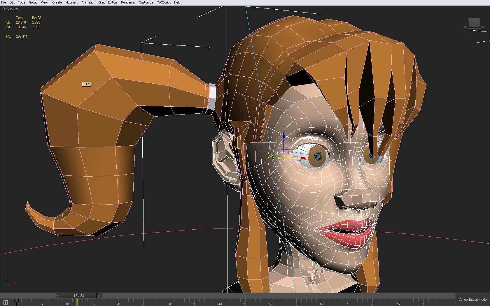 El primer problema serio que tengo es en el pelo, tengo que elegir que sea Hair and Fur o, por el contrario como es ahora, geometría. El resultado debe ser cartoon así que, no tiene por qué ser realista, teniendo esto en cuenta ¿Qué sería lo mejoré no sé cómo podría añadir la animación al Hair and Fur y tampoco como animarlo con Bones o con el Biped, ya que no tiene la opción de sacar apendices de la cabeza, que yo sepa. Un saludo.