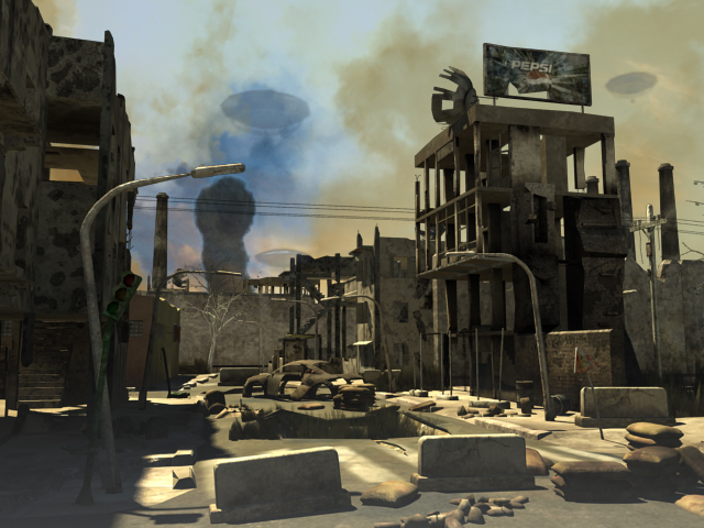 Los edificios principales están unidos al terreno. El cielo son nubes imágenes alpha de partículas.