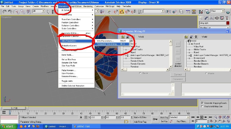6.- Now you can se the Butterfly fluttering only one Wing, we had todo create the same animation for the second Wing also. Let me show you how. Enable the parameter wire dialogue from animation>wire parameters.
