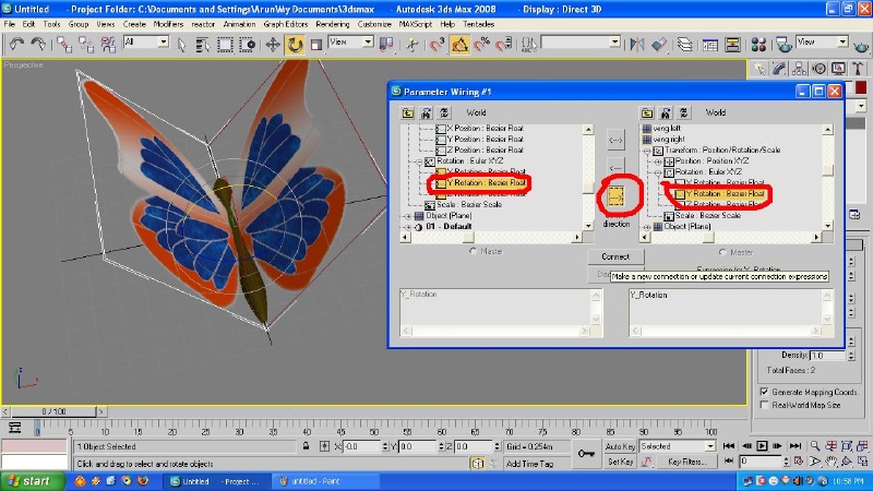 7.- in the window select the y rotation parameter for each Wing you created, you can find it in the object list available in the left and right panels. And then click the arrow Marks in the middle of the panel and click connect. WoW. Your Butterfly is fluttering its Wing. Is that easy?