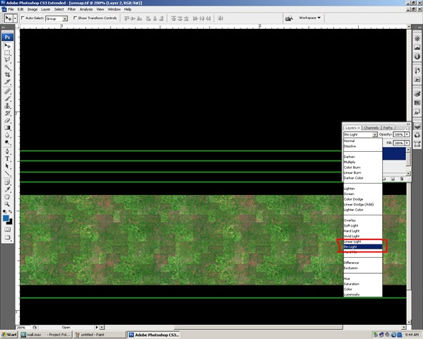 After covering the entire área with Grass picture, in the layer window, change the blending mode todo pin light.