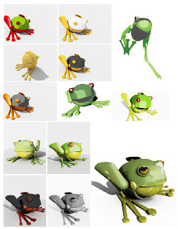 For the concrete case of the frog, y experimented a lot with diferent Shader settings, both in the Blender internal renderer and Yafray, that gave me diferent styles.